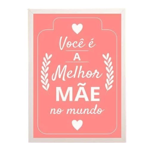 Quadro você é a melhor mãe do mundo - rosa 24x18cm - com vidro Moldura: madeira branca Informações do produto Decoração para quarto, sala, cozinha, escritório, área gourmet e muito mais. Chega de paredes vazias Medidas - cada peça tem 24x18cm a5 . Material do papel - papel fotográfico brilhante de altíssima resolução Acabamento - todos os quadros são acompanhados de vidro para proteção da imagem. - Moldura em madeira maciça e pendurador. - Os quadros são embalados de forma segura com plástico bolha com camada dupla de acordo com o tamanho dos quadros. - de 3 meses. Meu quadro chegou. Como posso fixá-lo Você precisa apenas de um martelo e um prego, pois os quadros já vão acompanhados de penduradores. Esta é a forma mais indicada. Como posso limpar meu quadro A limpeza é feita como um móvel comum da sua casa. Apenas um pano seco ou espanador são suficientes para tal Marca: Não Informado