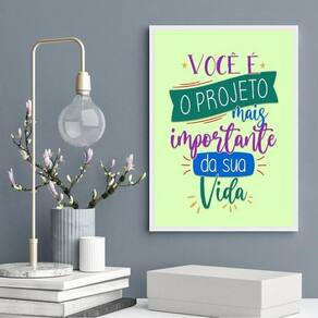 Quadro você é o projeto mais importante 45x34cm - com vidro Cor: moldura preta Informações do produto tire todas as suas dúvidas no descritivo abaixo: decoração para quarto, sala, cozinha, escritório, área gourmet e muito mais. Chega de paredes vazias medidas - cada peça tem 45x34cm a3 . Material do papel - papel fotográfico brilhante de altíssima resolução acabamento - todos os quadros são acompanhados de vidro para proteção da imagem. - moldura em madeira maciça na cor preta ou branca conforme produto escolhido e pendurador . - os quadros são embalados de forma segura com plástico bolha com camada dupla de acordo com o tamanho dos quadros. - de 3 meses. Meu quadro chegou. Como posso fixá-lo Você precisa apenas de um martelo e um prego, pois os quadros já vão acompanhados de penduradores. Esta é a forma mais indicada. Como posso limpar meu quadro A limpeza é feita como um móvel comum da sua casa. Apenas um pano seco ou espanador são suficientes para tal Marca: Não Informado