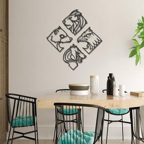 Especificações Técnicas: Medidas: comprimento: 30 cm altura: 3mm largura: 30 cm Material: mdf 3mm Cor: preto Tema: natureza Formas de instalação: basta utilizar fitas dupla face Quantidade: 4 unidades Características específicas: são 4 quadros medindo 30×30 cada um. cada animal representa um elemento da natureza: água, fogo, terra e ar.