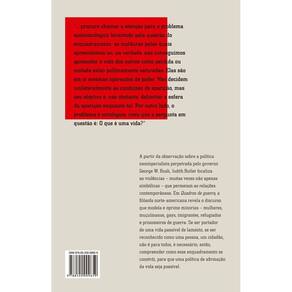 "Uma ampla interrogação transgressora e peculiar sobre como o poder enquadra nosso olhar sobre os corpos, seus significados e valores. A partir da observação sobre a política neoimperialista perpetrada pelo governo George W. Bush, Judith Butler, autora de Problemas de gênero, identifica as violências - muitas vezes não apenas simbólicas - que permeiam as relações contemporâneas. Nos seis ensaios que compõem Quadros de guerra, a filósofa norte-americana revela o discurso que modela e oprime minorias - mulheres, muçulmanos, gays, imigrantes, refugiados e prisioneiros de guerra. Se ser portador de uma vida passível de luto, se ser reconhecido como uma pessoa, um cidadão, não é para todos, é necessário, então, compreender como esse enquadramento se constrói, para que uma política de afirmação da vida seja possível. "