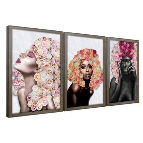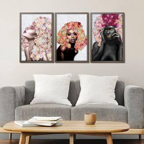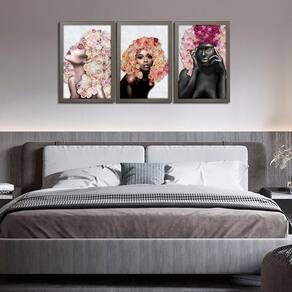 Kit 3 Quadros Decorativos 30x45 Mulheres Rosto Flores Rosas
