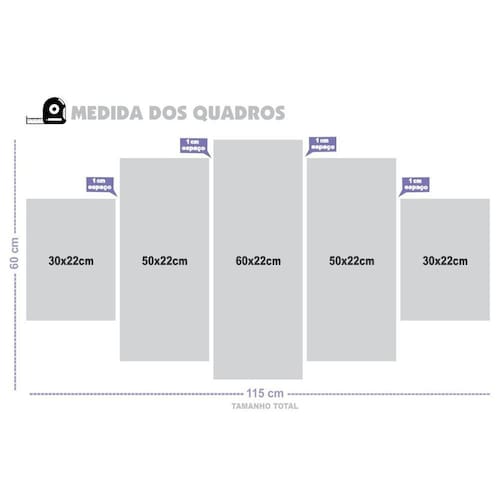 Tamanho total do quadro montado na parede: 115cm x 60cm