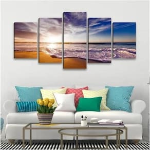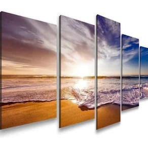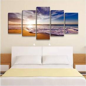 Conjunto 05 Quadros. Tamanho total: 115cm(comprimento)X60cm(altura) Peças menores: 02 unidades - 22x35 cm Peças médias: 02 unidades - 22x50 cm Peça central: 01 unidade - 22x60 cm Espaçamento entre as peças: 2 cm Não acompanha Vidro.