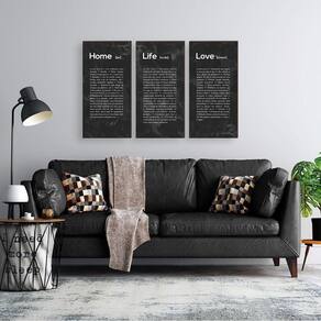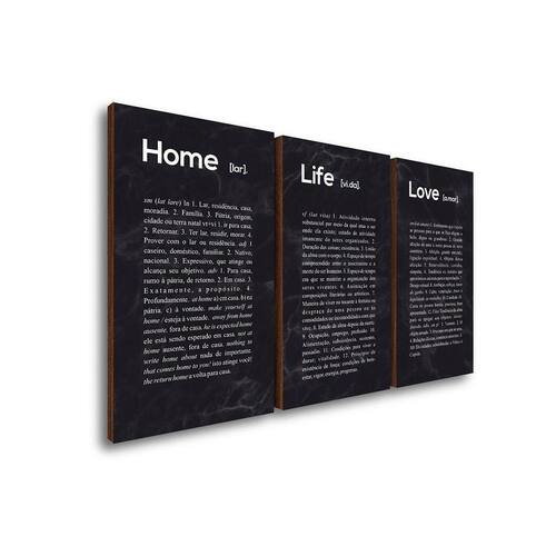 Quadros decorativos trio home life love + texto para sala Uma parede branca, sem vida e sem graça pode ser completamente modificada em poucos segundos. Como A gente te explica: Com os nossos quadros decorativos a sua casa vai ganhar personalidade, identidade e beleza. - - - Box de madeira: nossos quadros são todos feitos em mdf. Eles possuem 3cm de profundidade alto relevo , o que garante destaque em qualquer parede. Cubra o que quiser: essa profundidade permite que você cubra caixas de luz, buracos ou imperfeições da sua parede. Deixe à vista só o que você deseja Feito no brasil: nossa fabricação é própria e passa por um minucioso controle de qualidade. Alta definição: todos os quadros são produzidos com imagens em altíssima definição e ótimo acabamento. Possuem a qualidade que a sua casa merece Cor de verdade: seguimos padrões rígidos de qualidade. Ainda assim pode haver uma pequena diferença na percepção das cores entre a impressão e o que você vê no seu monitor . Isso se dá por conta da configuração da sua tela de computador ou celular. Mas, fique tranquilo a . O resultado é sempre incrível e a qualidade é garantida Fácil de fixar: esqueça a briga com os pregos e parafusos para deixar seu quadro retinho Comprando hoje você ganha nosso kit instalação Dispensa vidro/fácil de limpar: nosso modelo dispensa o uso de vidro ou molduras. Para limpar, basta um pano seco ou espanador. Satisfação garantida: não gostou do produto Não tem problema, nós devolvemos o seu dinheiro - - - Nossa equipe está só esperando o seu ok para enviar essa maravilha para a sua casa. E aí, vamos transformar sua parede juntos Marca: Meu Rodapé