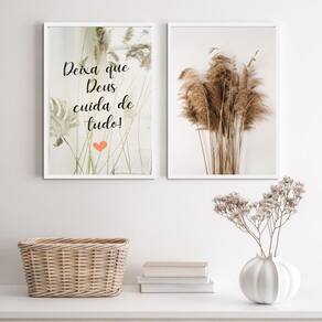 Especificações Técnicas: - Título: Kit 2 Quadros Deixa Que Deus Cuida De Tudo 45X34Cm - Medidas: 45x34cm cada peça - Moldura: Madeira branca - Material do papel: Papel fotográfico brilhante de altíssima resolução - Acabamento: Película de acetato para proteção da imagem - Embalagem: Plástico bolha de camada dupla - Garantia: 3 meses