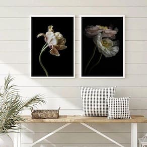 Kit 2 Quadros Flores Tons Bege Fundo Preto 45x34cm