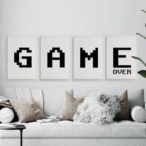 O Kit Quadros Game Over Preto E Branco 24x18cm 4 Peças é perfeito para decorar diferentes ambientes, como quarto, sala, cozinha, escritório e área gourmet. Composto por 4 quadros com o tema Game Over, esse kit trará um toque único e divertido à sua decoração. Cada peça possui dimensões de 24x18cm A5 e é feita com papel fotográfico brilhante de altíssima resolução, garantindo uma imagem nítida e de qualidade. Além disso, os quadros contam com uma moldura de madeira branca, que traz elegância e sofisticação à composição. Para proteger a imagem, cada quadro é acompanhado por uma película de acetato. Isso garante que a imagem fique preservada por mais tempo, sem perder a sua nitidez e cores vibrantes. Na hora de fixar os quadros na parede, você pode utilizar os penduradores que já vêm inclusos. Basta ter um martelo e um prego para fazer a instalação de forma rápida e prática. Caso prefira, também é possível utilizar uma fita dupla face de alta qualidade. A limpeza dos quadros é simples e fácil. Basta utilizar um pano seco ou um espanador para remover o pó e manter a sua aparência sempre impecável. Garanta já o Kit Quadros Game Over Preto E Branco 24x18cm 4 Peças e deixe a sua decoração ainda mais criativa e personalizada. Aproveite a de 3 meses e tenha a certeza de estar adquirindo um produto de qualidade. Não perca essa oportunidade!