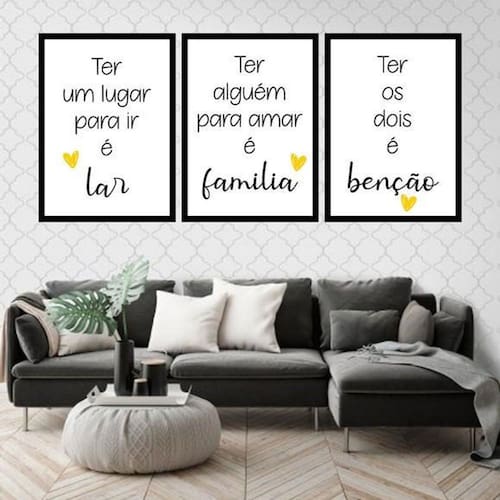 Itens inclusos 03 Quadros Decorativos Lar, Família, Benção -Amarelo 24 x 18 Cm