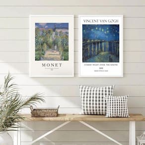Os quadros possuem moldura de madeira branca, garantindo um acabamento elegante e sofisticado. Além disso, eles são acompanhados de uma película de acetato para proteção da imagem, garantindo a durabilidade e a qualidade das paisagens de Monet e Van Gogh.