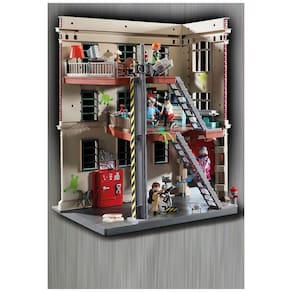 O conjunto Playmobil Ghostbusters Firehouse reproduz o quartel-general dos Caça-Fantasmas em uma estrutura de três andares, com fachada detalhada, portão de garagem deslizante e área interna aberta para acesso completo às cenas de brincadeira. A construção inclui laboratório, escritório, sala de controle e área de garagem, permitindo organizar equipamentos e personagens em diferentes níveis do edifício.