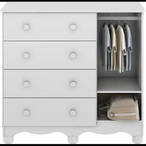 04 gavetas com corrediças metálicas e 01 porta com mini cabideiro.Tampo com bordas laqueadas; Gavetas com corrediças metálicas;