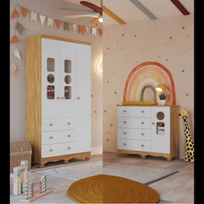 04 gavetas com corrediças metálicas e 01 porta com mini cabideiro.Tampo com bordas laqueadas; Gavetas com corrediças metálicas;