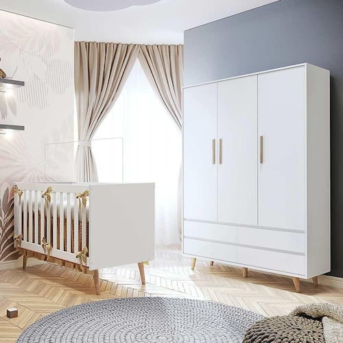 O conjunto é composto por um Berço Americano 3 em 1, que acompanha o crescimento do bebê, e um Guarda-Roupa espaçoso com 3 portas, ideal para manter tudo sempre bem organizado.