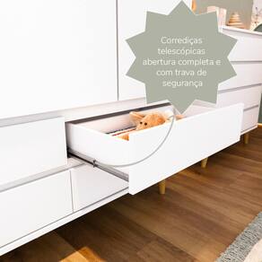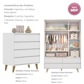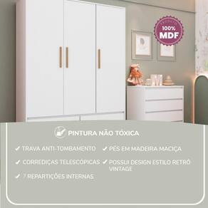 Produzido em 100% MDF, com pés em madeira maciça, o conjunto proporciona maior estabilidade e durabilidade. A pintura UV atóxica torna o ambiente mais seguro para o bebê.