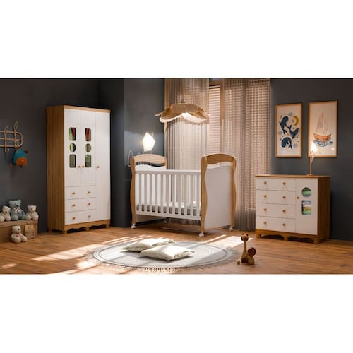 O Berço Júnior 2020 é um produto padrão americano, fabricado 100% em MDF e possui pintura atóxica. Seu estrado possui altura regulável e é fabricado em MDF e madeira/laminado de madeira. As grades são em MDF e as cabeceiras são em chapa de 15 mm. Possui bordas arredondadas e laqueadas, proporcionando maior segurança e uma sensação agradável ao toque.Acompanha suporte mosquiteiro;