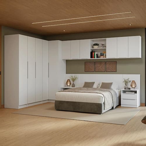 O Quarto Completo de Casal Neo oferece organização inteligente com prateleiras bem distribuídas, gavetas amplas e cabideiros para melhor aproveitamento de espaço. O ambiente ganha ainda mais charme e funcionalidade com a cabeceira acompanhada de duas mesas de cabeceira e cinco armários aéreos, incluindo um nicho aberto.