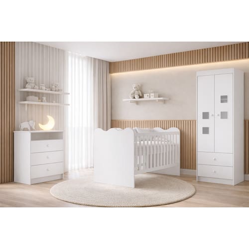 O guarda-roupa, com 2 portas e 2 gavetas, proporciona ótimo espaço para manter roupinhas, acessórios e itens do dia a dia sempre bem organizados. O berço, além de acompanhar colchão, conta com 3 níveis de altura do estrado, oferecendo mais conforto e praticidade em cada fase, e ainda se transforma em mini cama, acompanhando o crescimento da criança com versatilidade. Já a cômoda, com 3 gavetas, complementa o conjunto com organização inteligente e design diferenciado.
