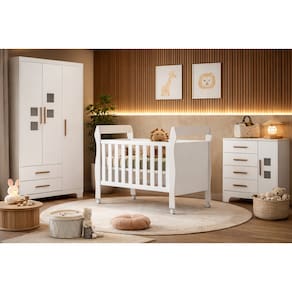 O guarda-roupa, com 4 portas e 2 gavetas, proporciona ótimo espaço para manter roupinhas, acessórios e itens do dia a dia sempre bem organizados. O berço, além de acompanhar colchão, conta com 3 níveis de altura do estrado, oferecendo mais conforto e praticidade em cada fase, e ainda se transforma em mini cama, acompanhando o crescimento da criança com versatilidade. Já a cômoda, com 4 gavetas e 1 porta, complementa o conjunto com organização inteligente e design diferenciado.