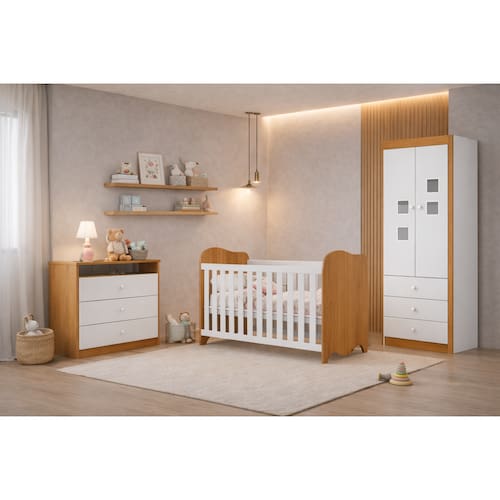 O guarda-roupa, com 2 portas e 2 gavetas, proporciona ótimo espaço para manter roupinhas, acessórios e itens do dia a dia sempre bem organizados. O berço, além de acompanhar colchão, conta com 3 níveis de altura do estrado, oferecendo mais conforto e praticidade em cada fase, e ainda se transforma em mini cama, acompanhando o crescimento da criança com versatilidade. Já a cômoda, com 3 gavetas, complementa o conjunto com organização inteligente e design diferenciado.