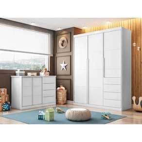 Jogo de Quarto Infantil Pérola branco Acetinado - Phoenix Baby Os móveis para o quarto do seu bebê com qualidade e bom preço você encontra aqui a Phoenix Baby desenvolveu a linha Pérola, cômoda e guarda roupa infantil para você mamãe que procura móveis de qualidade superior e que apresentam amplo espaço e lindo design confira! Organizar as roupas e acessórios do bebê com total conforto e praticidade é aqui. Características técnicas: Cômoda Infantil - Desenvolvida em mdf - Cor branco Acetinado - 2 portas com detalhes usinados - Dobradiças em metal - Puxadores usinados ergonômicos - Gavetas com corrediças telescópicas livres de qualquer enrosco no abrir e fechar - Cabideiro - 2 Prateleiras auxiliando na organização das roupas e acessórios do bebê - Amplo espaço - Lindo design Dimensões: Altura: 97 cm Largura: 128 cm Profundidade: 52 cm Guarda roupa infantil - Desenvolvida em mdf - Cor branco Acetinado - 3 portas com detalhes usinados - Dobradiças em metal - Puxadores usinados ergonômicos - 4 Gavetas com corrediças telescópicas livres de qualquer enrosco no abrir e fecha - Repartição nicho - Maleiro - Cabideiro - Prateleiras auxiliando na organização das roupas e acessórios do bebê - Amplo espaço - Lindo design Dimensões: Altura: 220 cm Largura: 165 cm Profundidade: 52 cm Obs: Não realizamos a montagem porem acompanha manual de montagem Garantia: 3 meses Montagem: Recomendamos que a montagem seja feita por um profissional. Recomendação de Limpeza: Utilize pano levemente úmido. Observações: - Nos responsabilizamos pela entrega dos produtos até onde as rodovias alcançam, entregas fluviais ou aéreas devem ser cotadas a parte - As imagens são ilustrativas, não acompanham objetos de decoração - A montagem será de responsabilidade do comprador. Não nos responsabilizamos, no ato da entrega, por subir escadas/elevadores ou transporte por guincho em apartamentos. Eventuais despesas são de responsabilidade do comprador. - Confira as dimensões do produto e certifique-se de que passará normalmente por supostos elevadores, portas, escadas e/ou corredores de sua residência. Ean: 7894983502063