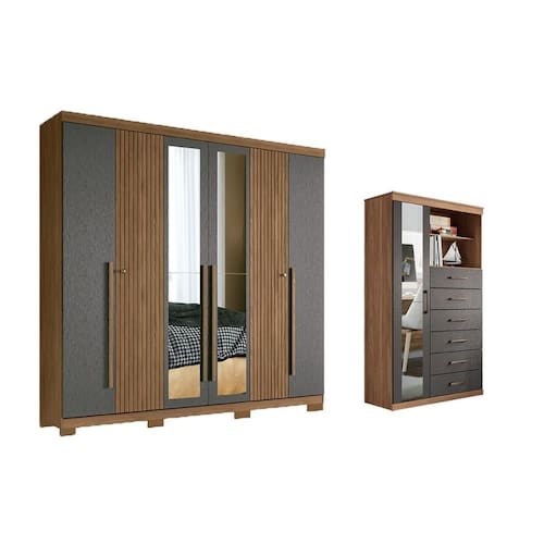 GUARDA ROUPA CASAL 6 PORTAS (2 RIPADAS) E 4 GAVETAS C/ ESPELHO E PÉS BURITI JATOBÁ/GRAFITE SANTOS ANDIRÁ