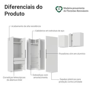 Os diferenciais da linha Neo garantem mais durabilidade no dia a dia: ferragens de alta qualidade, como dobradiças com amortecimento, gavetas com corrediças de abertura total, cabideiros metálicos e puxadores slim em alumínio que completam o design sofisticado. O acabamento branco de alta resistência facilita a combinação com diferentes estilos de decoração.