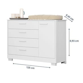 1x Cômoda para Quato de Bebê 1 Porta e 4 Gavetas Zaki Branco Fosco Largura: 125 cm Altura: 93 cm Peso: 48,1 kg Profundidade: 45 cm Necessita Montagem: Sim