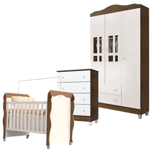 Quarto de Bebê 3 Portas com Gaveteiro Ariel e Berço New Nanda Branco Acetinado Amadeirado - Carolina