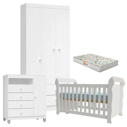 Quarto de Bebê 3 Portas com Gaveteiro Ternura Baby e Berço Lara Branco Brilho com Colchão Gazin Incorplac