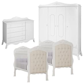 Quarto de Bebê 4 Portas com 2 Berços e Cômoda 1 Porta Realeza Branco Acetinado com Capitonê - Canaã