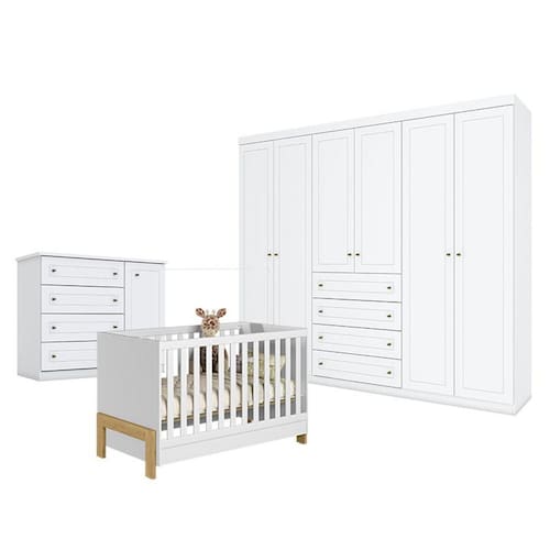 Quarto de Bebê Americano 6 Portas com Berço Americano Mini Cama Fantasia Branco Acetinado – Qmovi - Henn