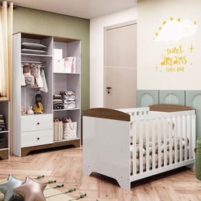Proposta desenvolvida para oferecer qualidade, beleza, conforto e segurança para toda família na hora de montar o quartinho do(a) bebê. Produtos estrurados em 100% MDF e com acabamento em pintura UV atóxica. O berço possui padrão de colchão americano, estrado com altura regulável e todas as bordas arredondadas e laqueadas, que proporcionam mais segurança e uma sensação agradável ao toque. Já o guarda roupas possui gavetas que deslizam suavemente por corrediças telescópicas, facilitando a abertura, cabideiro metálico e algumas prateleiras que são ideais para acomodar as peças com organização da sua preferência. Também acompanha o produto, 2 opções de rodapés, um usinado (torneado) e outro retrô, para que você escolha no momento da montagem qual se adequa ao estilo do ambiente. Aproveite para adquirir o seu agora! Ambiente composto por: - 1 Guarda Roupa Infantil 4 Portas com Janelas Retangulo e 2 Gavetas 100% MDF 194,5 x 92,9 x 42 (AxLxP - cm) - 1 Berço Americano 100% MDF 85 x 133 x 76 (AxLxP - cm) Ambiente Principal: Quarto de Bebê codigo_ean: 7909903356999 Cor: Branco Brilho/Carvalho Estrado com Regulagem de Altura: Sim Informação Complementar: 1x Guarda Roupa Infantil 4 Portas com Janelas Retângulo 2 Gavetas 100% MDF Cocada Branco Brilho/CarvalhoLargura: 123,2 cmAltura: 194,5 cmPeso: 6,74E+15 kgProfundidade: 42 cmNecessita Montagem: Sim1x Berço Americano 100% MDF Ayla Branco/CarvalhoLargura: 133Altura: 85Peso: 2763Profundidade: 76Necessita Montagem: Sim Material Principal: MDF Permite a Utilização de Cama Auxiliar: Não Pintura Atóxica: Sim Possui Rodízio: Não