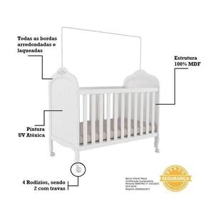 O berço é um charme com suas bordas curvas e rodízios, sendo 2 com travas. Além disso, é certificado pelo INMETRO e pode ser utilizado como Mini Cama ou Mini Sofa, acompanhando o crescimento do seu bebê.