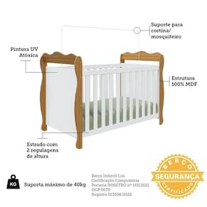 Produtos estrurados em 100% MDF e com acabamento em pintura UV atóxica. O berço possui padrão de colchão americano, estrado com altura regulável e todas as bordas arredondadas e laqueadas, que proporcionam uma sensação agradável ao toque, além de poder ser utilizado como minicama ou minisofá, prolongando seu uso.