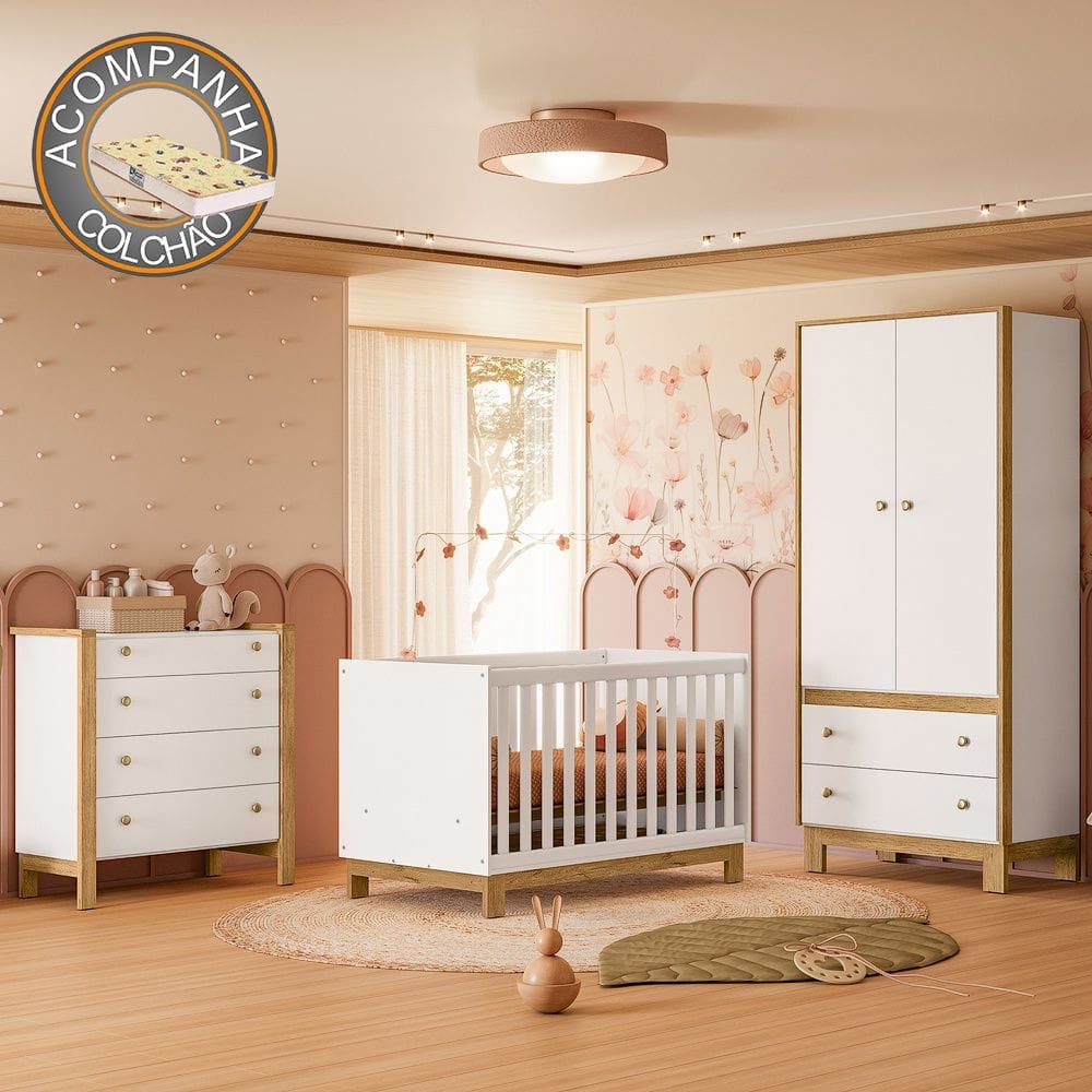 quarto de bebe colonial comoda e berco c rodizios e colchao nana nenem amore branco qmovi umaflex
