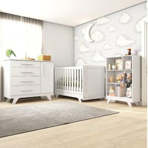 Quarto de Bebê com Berço Mini Cama Cômoda e Estante 5 Nichos Kakau Retrô Espresso Móveis Branco. Você já conhece Linha Kakau Retrô da Espresso Móveis. Se ainda não, prepare-se para se apaixonar! Desenvolvida com muito carinho, ela traz em seu design o estilo retrô que além de lindo da um charme ao ambiente. Sua estrutura é toda em MDF com acabamento em Pintura UV Atóxica, que oferece maior segurança para toda família. As gavetas possuem corrediças telescópicas e os puxadores são em MDF revestido. O berço é certificado pelo Inmetro, pode ser montado como mini cama e tem padrão de colchão americano (12x70x130 - AxLxP - cm). Tudo pensado para proporcionar momentos maravilhosos com seu bebê. Aproveite e adquira já o seu quartinho. Ean: 7908308754683