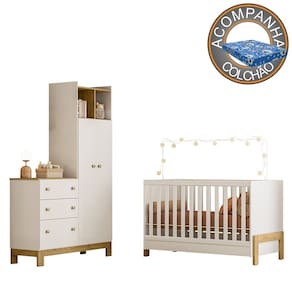 Quarto de Bebê com Berço Mini Cama Fantasia e Roupeiro com Cômoda QEncanto Slim Freijó Branco Acetinado Qmovi + Colchão Ortobom