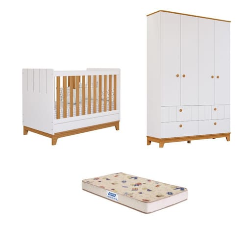Quarto de Bebê com Guarda Roupa Berço e Colchão Liza Permobili Encante-se com a versatilidade e o charme do Berço Mini Cama Liza. Seu estrado ajustável em 2 alturas e as 2 grades fixas proporcionam conforto e proteção para o sono do seu pequeno. E tem mais: ele se transforma facilmente em uma mini cama, acompanhando o crescimento do seu filho e prolongando sua utilidade. Crie um ambiente seguro e aconchegante para seu filho com o Berço Mini Cama Liza. O Guarda-Roupa de Bebê Liza combina durabilidade e estilo para o quarto do seu pequeno. Equipado com 4 portas, 4 gavetas espaçosas e prateleiras internas, proporciona amplo espaço para organizar roupas, acessórios e brinquedos. As dobradiças metálicas e corrediças telescópicas garantem suavidade e durabilidade no uso diário. Com capacidade para suportar até 3 kg por gaveta, este guarda-roupa é a escolha ideal para manter o quarto do seu filho organizado e funcional por muito tempo. O Colchão Infantil Supreme Gazin possui revestimento em tecido plano que diminui o acúmulo de poeira e materiais orgânicos, facilitando também na hora da higienização