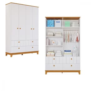 Características Guarda-roupa: Estrutura em MDF Acabamento em Pintura UV 4 Portas 4 Gavetas Corrediças telescópicas Dobradiças Slow Motion Suporta até 25kg Cada gaveta suporta até 3kg Puxadores em madeira maciça Pés em MDF