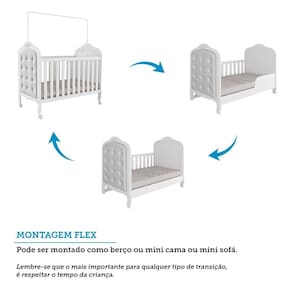 Montagem Flex: Sim, Guarda-roupas e Cômodas podem ser montados com ou sem pés. Berço pode ser montado como Berço, ou Minicama ou Minisofá.