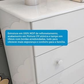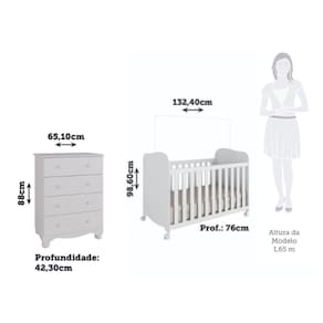 Berço: 98,6 x 132,4 x 76 (AxLxP) Acabamento da Gaveta: Pintura UV Acompanha Manual de Instalação: Sim Ambiente Principal: Quarto de Bebê Certificado: 013209/2022 codigo_ean: 7909903558133 Complexidade da Montagem: Alta: deve ser montado por um montador especializado Cor: Branco Brilho Cor do Produto: Branco Brilho Cor Interna: Branco Escala de Brilho: Brilhante Escala de Brilho da Gaveta: Brilhante Estampado: Não Estrado com Regulagem de Altura: Sim Estrado Regulável em Quantas Posições: 03 Informações Complementares: Material do Estrado: MDF e madeira/laminado de madeira Linha ou Coleção: Mimo Manual de Montagem e Instalação: https://product-hub-prd.madeiramadeira.com.br/889768/documents/be2bdd27-1d96-4690-bff5-c6106a4cf79117538566496.pdf Material da Gaveta: MDF Material do Estrado: MDF Material do Fundo: HDF Material do Puxador da Gaveta: Plástico Material Principal: MDF Medida de Cada Item: Cômoda: 88 x 65,1 x 42,3| Berço: 98,6 x 132,4 x 76 (AxLxP - cm) modular: Não Montagem Flex: Sim. A cômoda pode ser montado com rodapé usinado (torneado) ou reto. Necessita Montagem: Sim Origem do Produto: Nacional Permite a Utilização de Cama Auxiliar: Não Peso: Berço: 54,89kg |Cômoda: 21,7kg Peso de Cada Item: Berço: 54,89kg |Cômoda: 21,7kg Pintura Atóxica: Sim Possui Certificado: Sim Possui Gavetas: Sim Possui Grade: Sim Possui Portas: Não Possui Prateleiras: Não Possui Rodízio: Sim Possui Trocador: Não Quantidade de Gavetas: 04 Recomendações de Uso, Manutenção e Limpeza: Para limpeza utilizar somente pano limpo e macio, ligeiramente umedecido em água (apenas o bastante para remover a poeira), seguido de um pano seco. Sistema de Montagem: Parafusos autoatarraxantes, conjuntos minifix, cavilhas de madeira, acessórios plásticos e metálicos Suporta Até (kg): 40.0000 Tipo de Corrediça da Gaveta: Metálica Telescópica Tipo de Grade: Fixa Tipo de Puxador da Gaveta: Externo