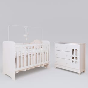 Nossas peças são em 100% MDF de alta resistência mecânica e ainda formam um par perfeito. O berço multifuncional é o melhor custo benefício, já que serve também como mini-cama e mini-sofá. A cômoda fraldário tem travas anti-tombamento que garantem mais para o seu bebê. Estes produtos se encontram disponíveis nas cores Branco e Branco com Bétula.