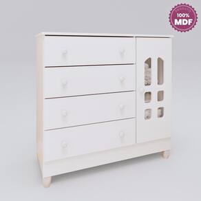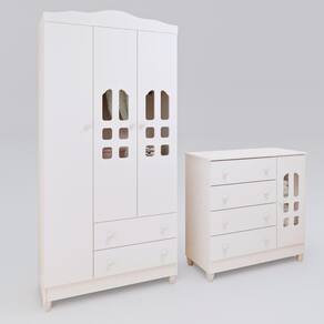 O dormitório perfeito para combinar com a decoração que você escolheu para acolher o seu baby. O guarda-roupa em que você tem ainda mais espaço para acomodar os pertences do seu bebê, de forma que as roupas não fiquem amassadas ou apertadas. Com cabideiro, prateleira e gavetas, as mamães podem organizar tudo de forma prática e funcional. Peça fabricada em 100% MDF de alta resistência mecânica, a cômoda é uma peça chave na organização de objetos, roupas e acessórios do bebê. O móvel tem um sistema de trava anti-tombamento e corrediça telescópicas nas gavetas. Este produto se encontra disponível nas cores Branco e Branco com Bétula.