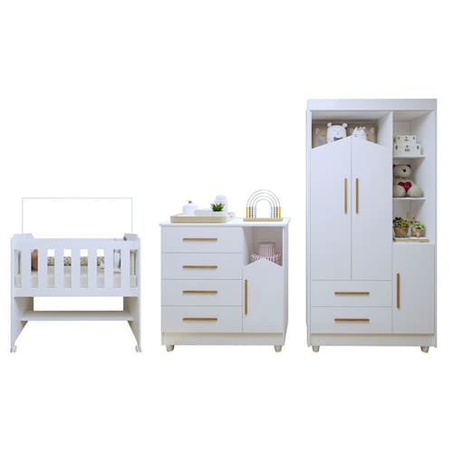 A cômoda oferece gavetas amplas, perfeitas para organizar todas as roupas e acessórios do bebê. O guarda-roupa, com ótimo espaço interno, ajuda a manter o ambiente sempre arrumado. Este conjunto combina design moderno e praticidade, criando um espaço acolhedor e seguro para o bebê em suas primeiras fases.