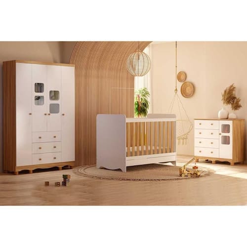 Quarto de Bebê Completo 3 Peças (1GuardaRoupa+1Berço+1Cômoda) QI125 Branco/Amendoa - Peroba - Blush