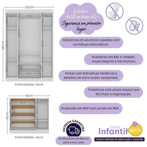 Diferenciais: - 3 anos de garantia contra defeitos de fabricação e material (exceto colchão). - Conjunto produzido em madeira de reflorestamento (MDP/MDF 12/15mm) com acabamento acetinado (cerca de 20% de brilho): sustentabilidade e durabilidade. - Berço 3 em 1 que se transforma em sofá e minicama, acompanhando o crescimento do bebê. - Lastro em madeira com 3 regulagens de altura e suporte para mosquiteiro para noites mais tranquilas e protegidas. - Berço certificado pelo INMETRO (Selo n 000332/2025). - Colchão D18 incluso: possui tratamento antiácaro, antialérgico, antimofo e um dos lados impermeável. - Frentes (guarda-roupa e cômoda) produzidas em MDF. - Guarda-roupa com 4 portas e 2 gavetas: amplo espaço para organizar roupinhas e acessórios. - Cômoda com 1 porta e 4 gavetas. - Detalhes de vidro incolor temperado 3mm nas portas: toque charmoso que permite visualizar o interior dos móveis. - Corrediças telescópicas: abertura total e silenciosa das gavetas. - Cabideiro em alumínio: permite acomodar roupas longas e curtas para que não amassem. - Puxadores em ABS delicados e práticos. - Rodapés: visual elegante para o guarda-roupa e a cômoda. - Sistema antitombamento no guarda-roupa e cômoda: proporciona segurança para o bebê e tranquilidade aos pais.