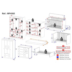 Conteúdo da Embalagem: 1 (um) Berço 1 (um) Colchão 1 (um) Guarda-roupa 1 (uma) Cômoda Manual de Montagem Kit Ferragem