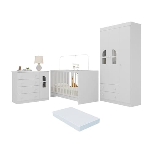 Diferenciais: - 3 anos de garantia contra defeitos de fabricação e material (exceto colchão). - Conjunto produzido em madeira de reflorestamento (MDP/MDF 12/15mm) com acabamento acetinado (cerca de 20% de brilho): sustentabilidade e durabilidade. - Berço 3 em 1 que se transforma em sofá e minicama, acompanhando o crescimento do bebê. - Lastro em madeira com 3 regulagens de altura e suporte para mosquiteiro para noites mais tranquilas e protegidas. - Berço certificado pelo INMETRO (Selo n 000332/2025). - Colchão D18 incluso: possui tratamento antiácaro, antialérgico, antimofo e um dos lados impermeável. - Frentes (guarda-roupa e cômoda) produzidas em MDF. - Guarda-roupa com 3 portas e 2 gavetas: amplo espaço para organizar roupinhas e acessórios. - Cômoda com 1 porta e 4 gavetas. - Detalhes de vidro incolor temperado 3mm nas portas: toque charmoso que permite visualizar o interior dos móveis. - Corrediças telescópicas: abertura total e silenciosa das gavetas. - Cabideiro em alumínio: permite acomodar roupas longas e curtas para que não amassem. - Puxadores em ABS delicados e práticos. - Rodapés: visual elegante para o guarda-roupa e a cômoda. - Sistema antitombamento no guarda-roupa e cômoda: proporciona segurança para o bebê e tranquilidade aos pais.