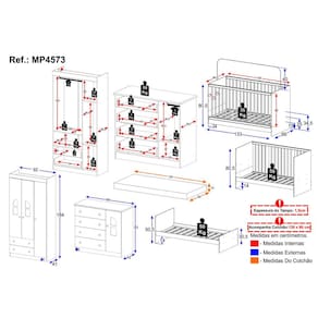 Conteúdo da Embalagem: 1 (um) Berço 1 (um) Colchão 1 (um) Guarda-roupa 1 (uma) Cômoda Manual de Montagem Kit Ferragem