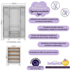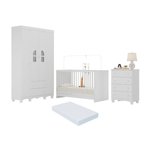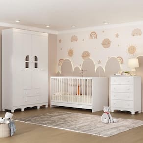 Diferenciais: - 3 anos de garantia contra defeitos de fabricação e material (exceto colchão). - Conjunto produzido em madeira de reflorestamento (MDP/MDF 12/15mm) com acabamento acetinado (cerca de 20% de brilho): sustentabilidade e durabilidade. - Berço 3 em 1 que se transforma em sofá e minicama, acompanhando o crescimento do bebê. - Lastro em madeira com 3 regulagens de altura e suporte para mosquiteiro para noites mais tranquilas e protegidas. - Berço certificado pelo INMETRO (Selo n 000332/2025). - Colchão D18 incluso: possui tratamento antiácaro, antialérgico, antimofo e um dos lados impermeável. - Frentes e rodapés (guarda-roupa e cômoda) produzidos em MDF. - Guarda-roupa com 4 portas e 2 gavetas: amplo espaço para organizar roupinhas e acessórios. - Cômoda com 4 gavetas. - Detalhes de vidro incolor temperado 3mm nas portas: toque charmoso que permite visualizar o interior dos móveis. - Corrediças telescópicas: abertura total e silenciosa das gavetas. - Cabideiro em alumínio: permite acomodar roupas longas e curtas para que não amassem. - Puxadores em ABS delicados e práticos. - Rodapés usinados e pés em polipropileno: elegância e estabilidade para o guarda-roupa e a cômoda. - Sistema antitombamento no guarda-roupa e cômoda: proporciona segurança para o bebê e tranquilidade aos pais.